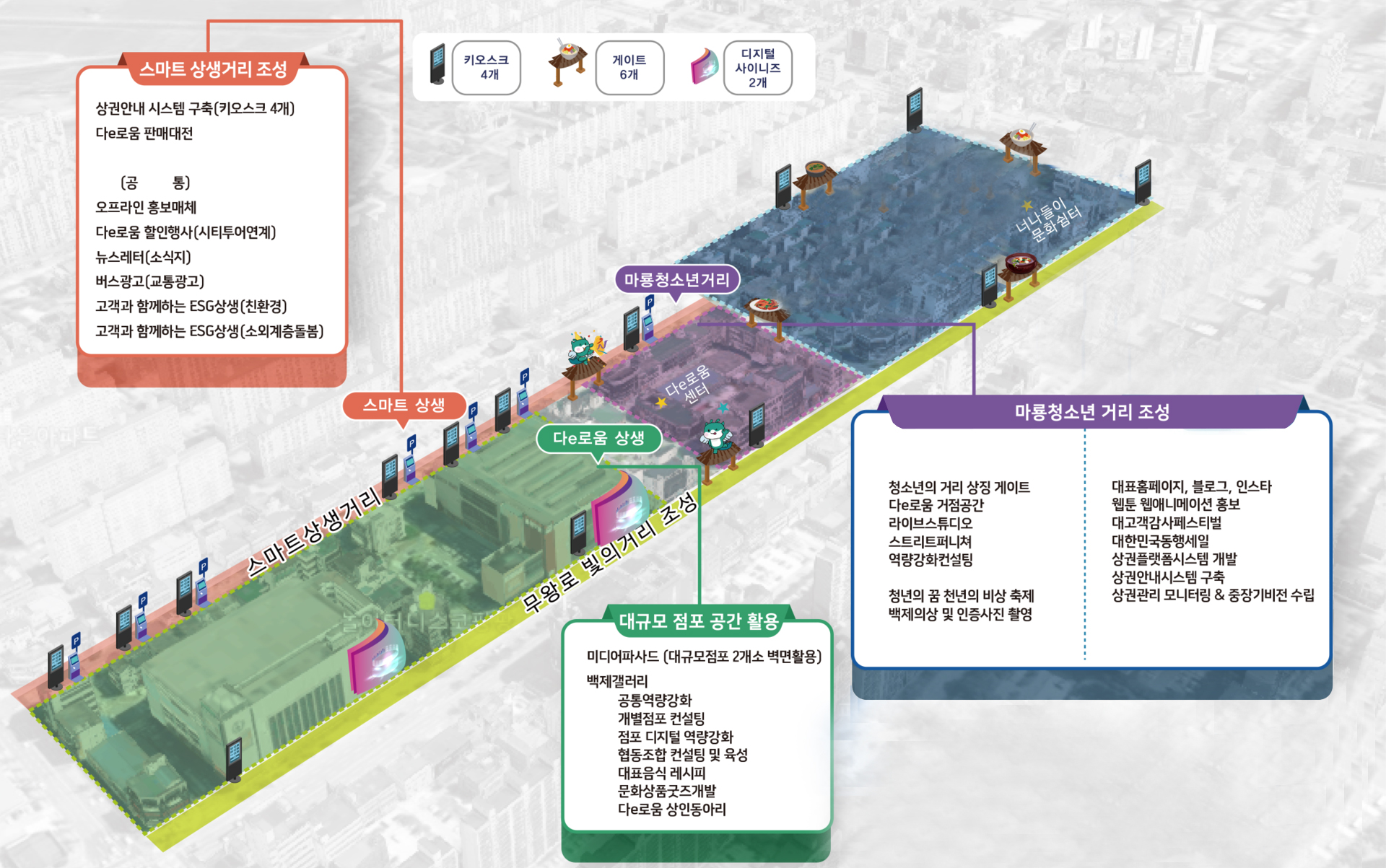 백제단길 내부를 동서남북으로 나누어 거리에 색깔을 칠해서